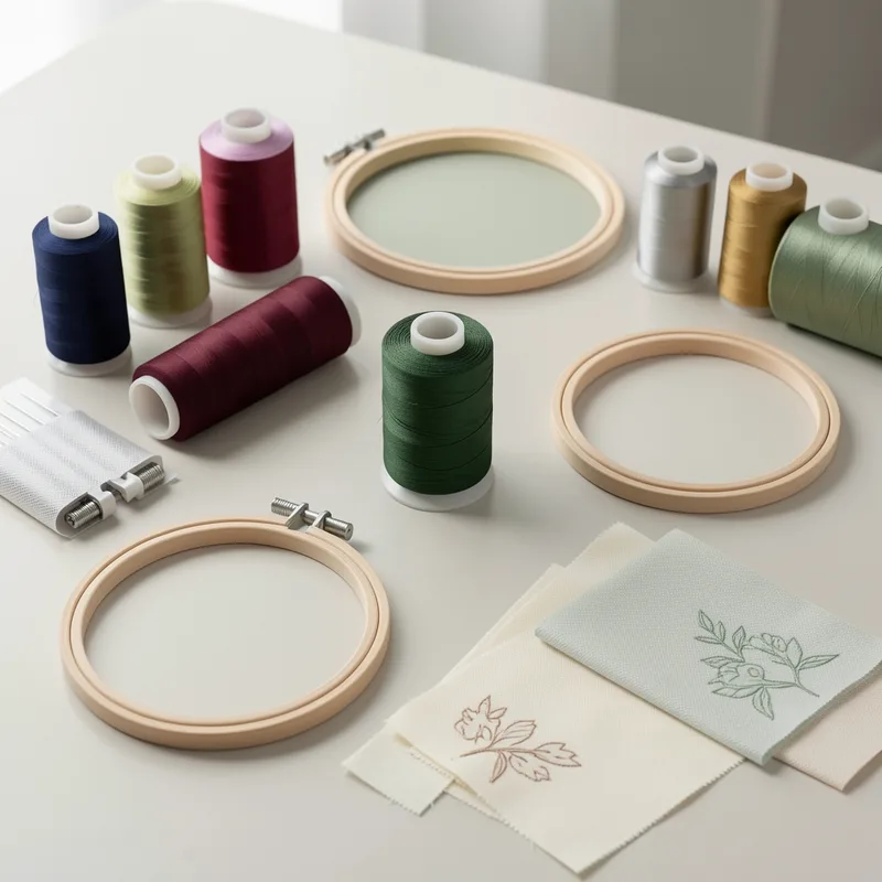 Découvrez le matériel indispensable pour broderie machine : fils polyester et rayonne, stabilisateurs, cerceaux magnétiques et aiguilles. Comparatif par tissu et projet.